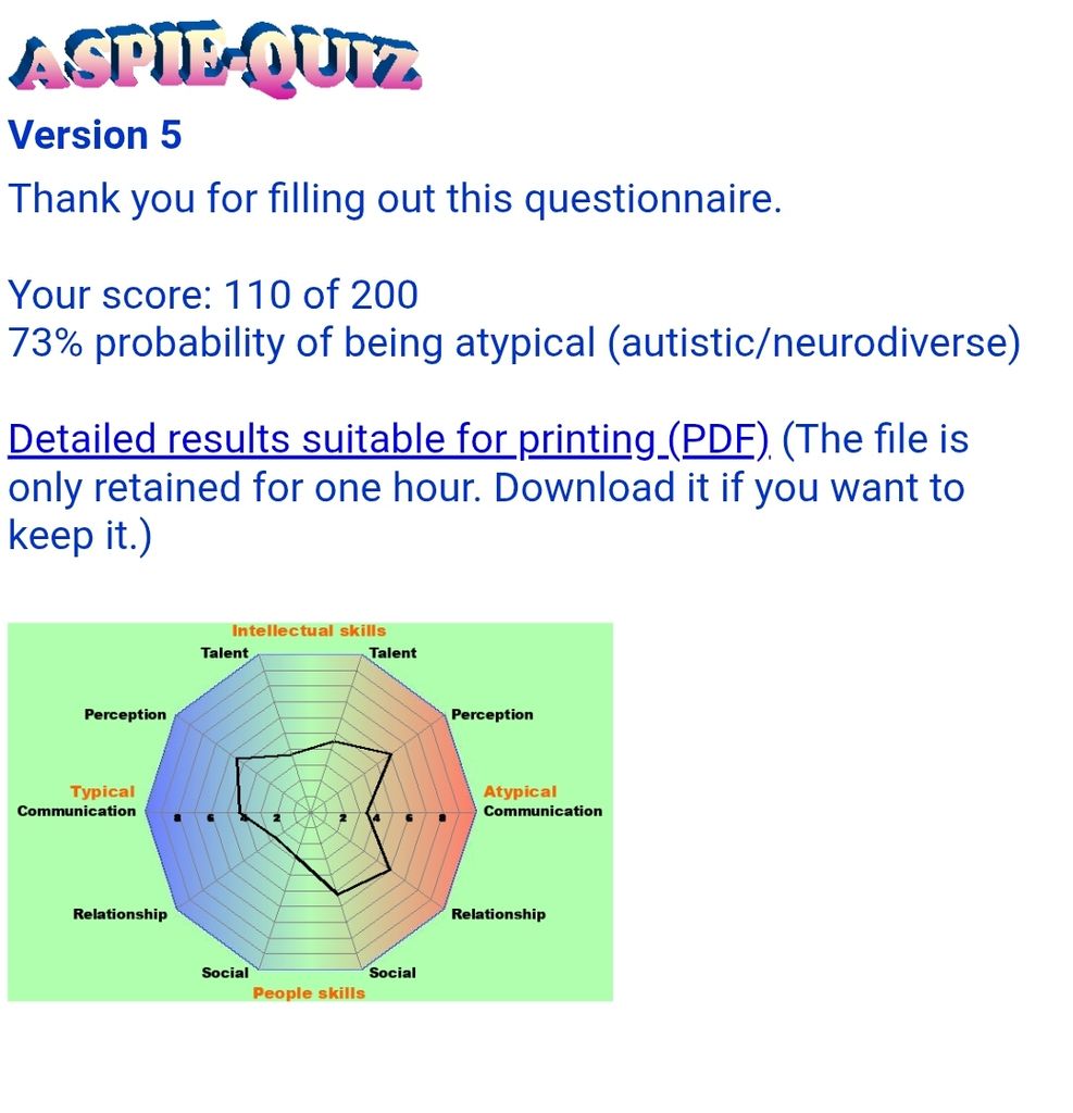 Ça veut absolument rien dire ça justement … c’est pas avec un score d’un test en ligne, même si il est similaire à celui de neuro typique que l’on peut savoir si oui ou non tu as un TSA !