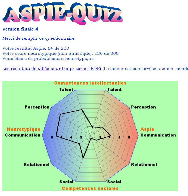 Ça veut absolument rien dire ça justement … c’est pas avec un score d’un test en ligne, même si il est similaire à celui de neuro typique que l’on peut savoir si oui ou non tu as un TSA !