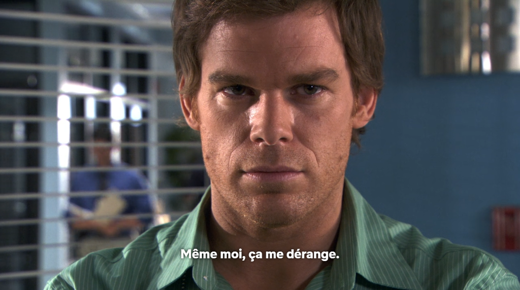 à chaque fois que je vois les stickers de dexter j'ai l'impression que c'est vraiment cliché dans la description du "psychopathe", il fait toujours le même visage à chaque fois, la caméra est toujours placé au même endroit, on dirait qu'ils ne savent pas représenter un "psychopathe" autrement que de cette manière c'est un peu dommage
