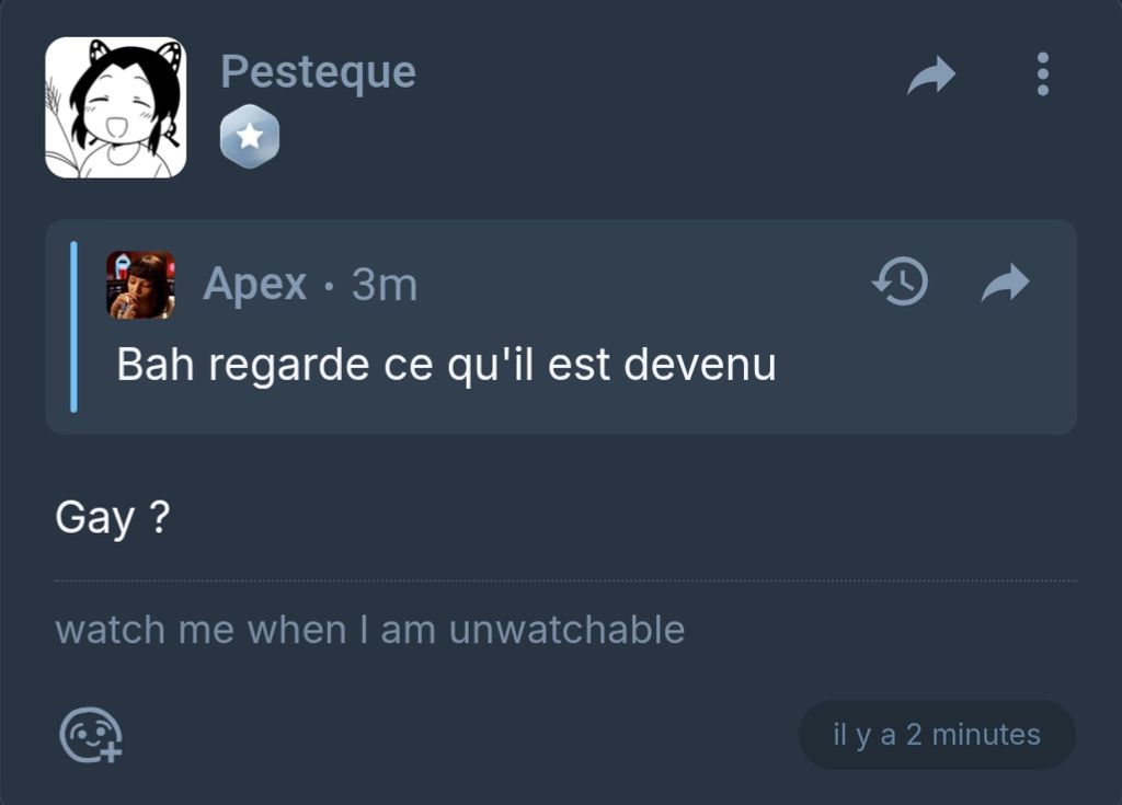 Je t'ai déjà dit que je pouvais apprécier voir des trucs localement mais suivre à la télé et tout flemme