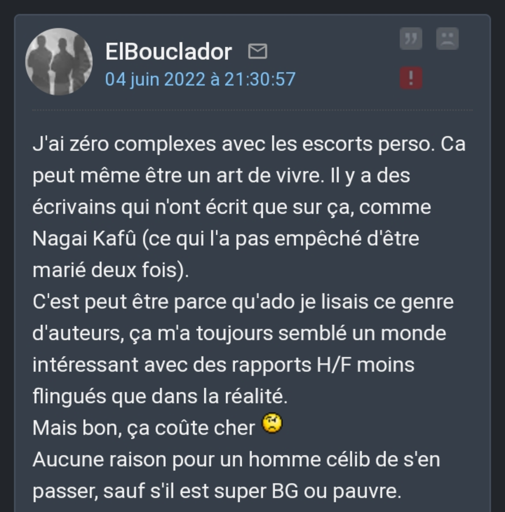 Non mais pas go escort (trop cher), juste le faire régulièrement quoi sinon qu'elle se plaigne pas si je met un coup à une collègue