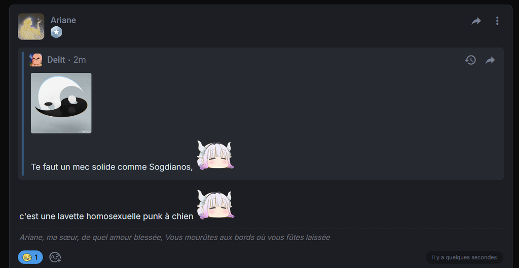 Sainte gentille : "Hihihih j'espère que t'as la gastro pour avoir le cul plein de merde" euh.. ok ?