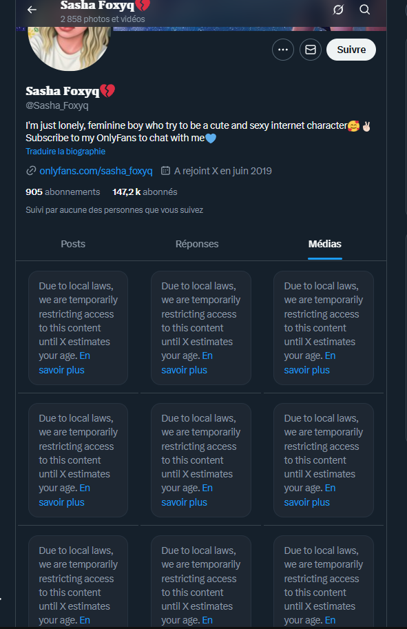 Mais avant ca je t'assure que nom , tous les media et post +18 t'avais le message " Due to local laws, we are temporarily restricting access to this content until X estimates your age. "