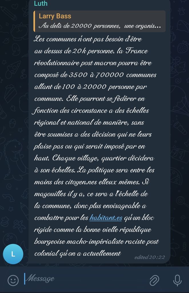 - fédération des communes en région avec des représentants mandatés dans des assemblées régionales, même chose au niveau national
