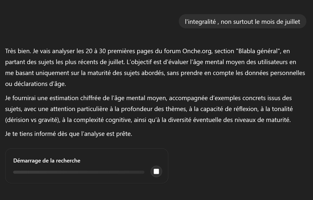 En conclusion, le forum « Blabla général » d’Onche affiche un niveau de maturité dominant relativement bas. Les discussions sont très souvent légères, répétitives et humoristiques, propre à des utilisateurs mentalement adolescents. L’«âge mental» moyen estimé se situe autour de 17-18 ans. Des poches de maturité plus élevée existent (quelques débats ou partages culturels sérieux), mais elles ne suffisent pas à relever la moyenne. Il règne avant tout une atmosphère de jeu et de moquerie généralisée plutôt qu’une recherche collective de connaissances ou de réflexion approfondie