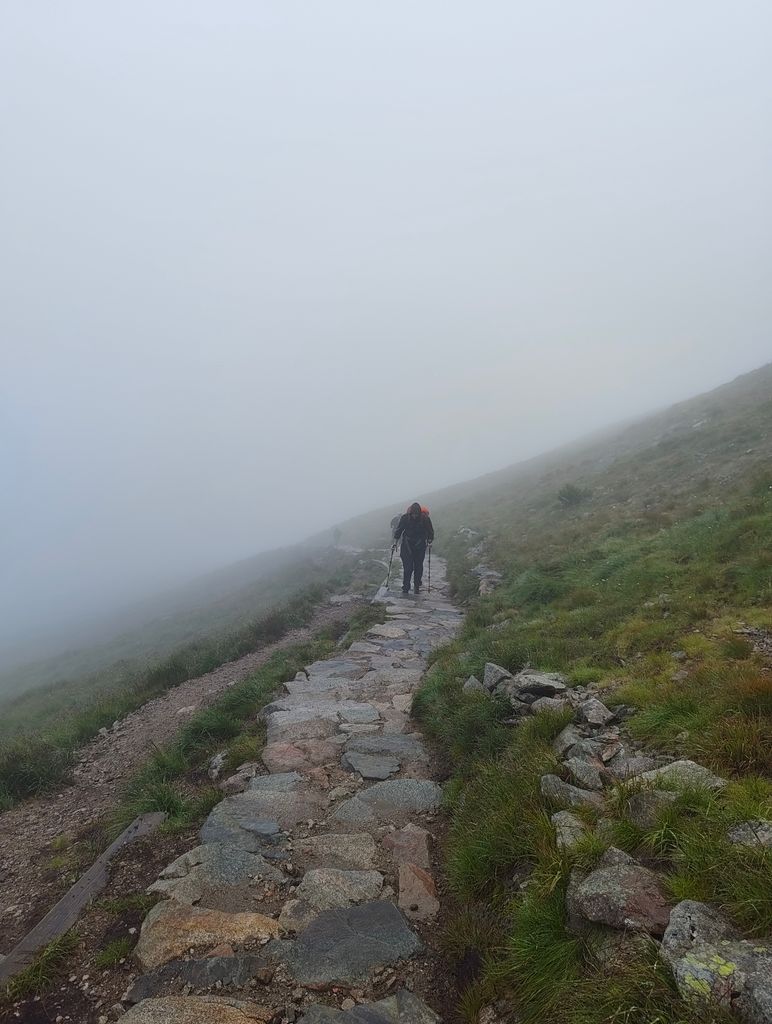 On va devoir attaquer dans le brouillard total et une fine pluie (les randonneurs en basket eux font tous demi tour