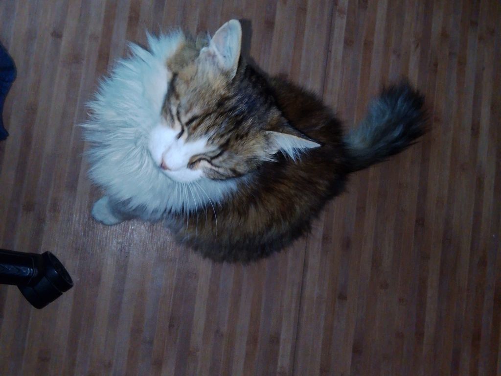 Elle a 4 ans, c'est une grosse flipette qui va se cacher dès qu'un bruit inhabituel survient mais est extrêmement joueuse et affective lorsqu'elle est dans un environnement calme. Elle miaule très peu (sauf quand je rentre le soir où là c'est la fête au village), par exemple pour dire qu'elle a faim elle à tendance à se planter devant moi et à ronronner comme une folle.