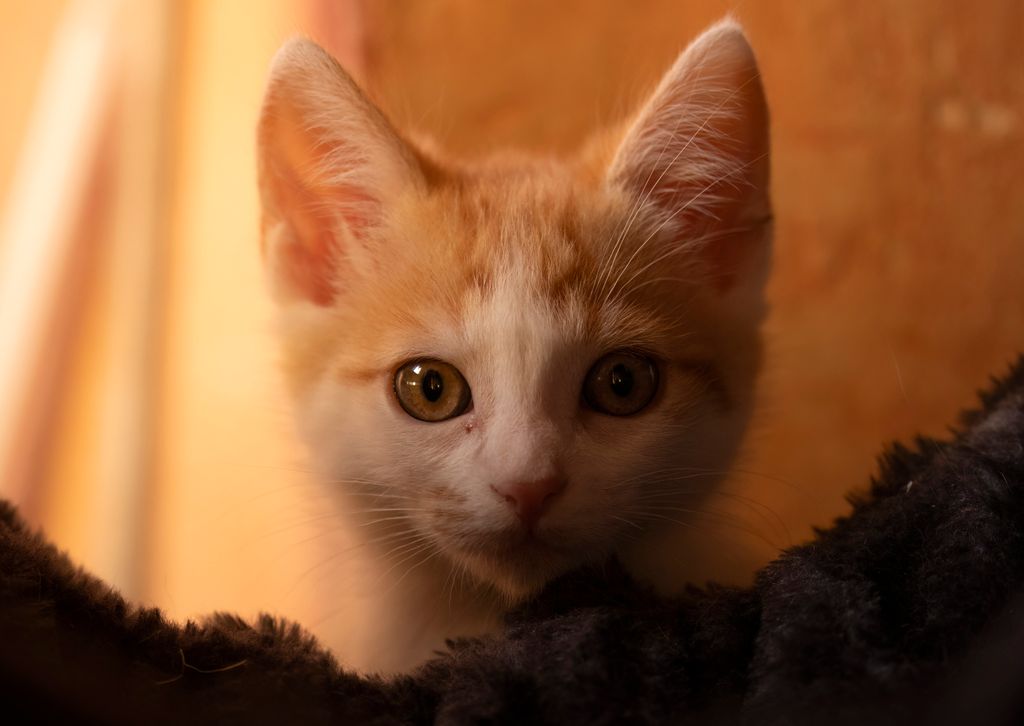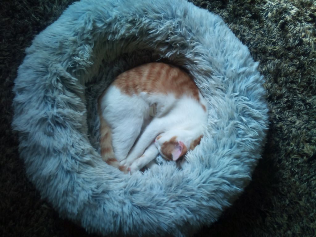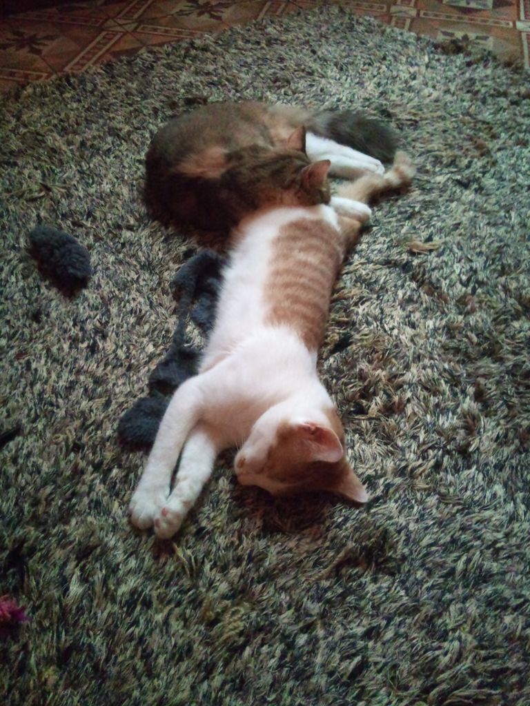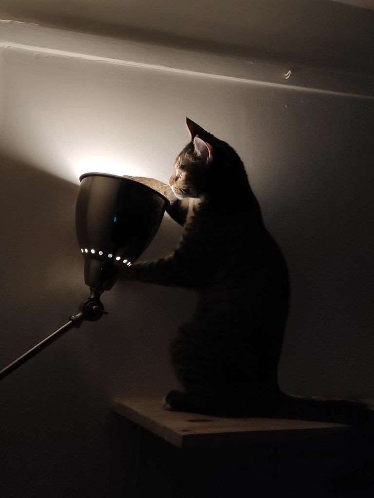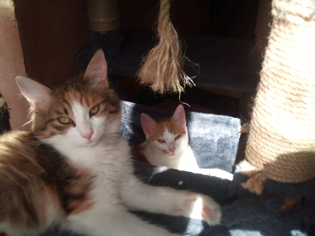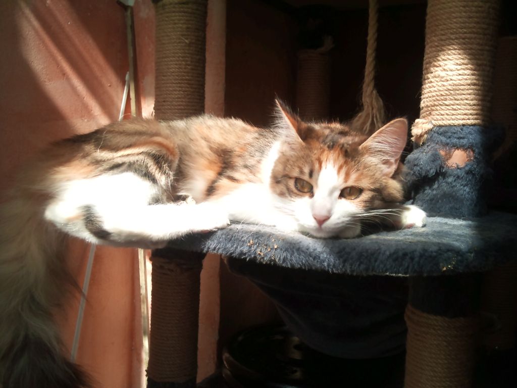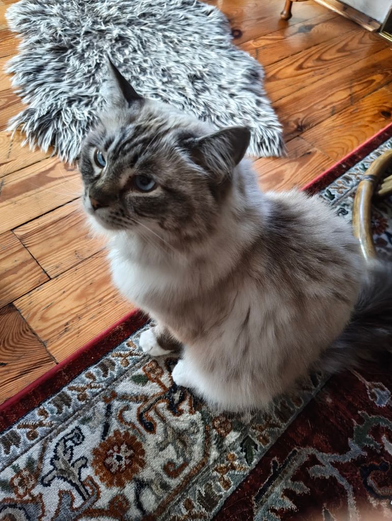 Elle a 4 ans, c'est une grosse flipette qui va se cacher dès qu'un bruit inhabituel survient mais est extrêmement joueuse et affective lorsqu'elle est dans un environnement calme. Elle miaule très peu (sauf quand je rentre le soir où là c'est la fête au village), par exemple pour dire qu'elle a faim elle à tendance à se planter devant moi et à ronronner comme une folle.