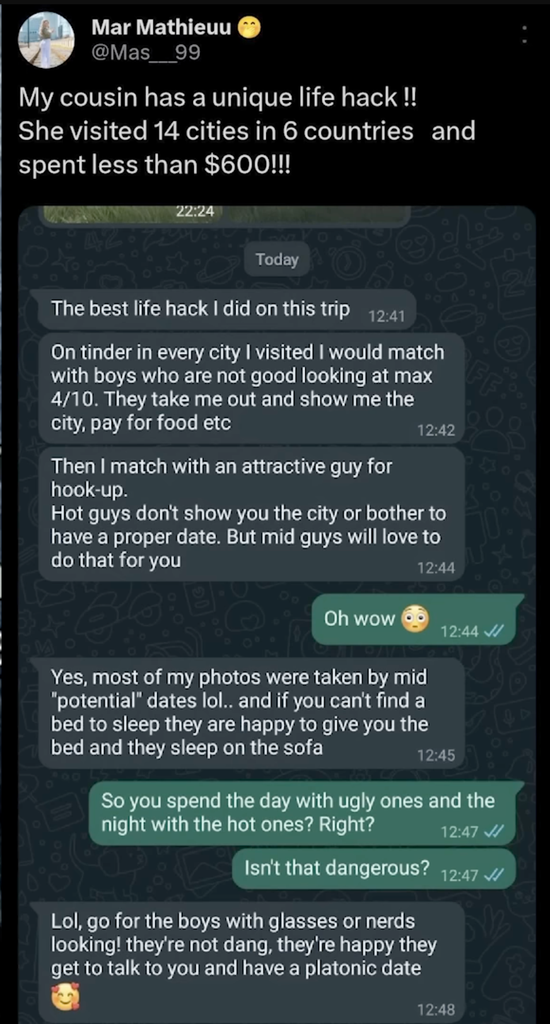 La meilleure astuce que j'ai utilisé pour ce voyage. Je vais sur tinder, je match avec des gars pas beau 4/10 maximum. Il sortent avec moi et me payent la nourriture et me montrent la ville.