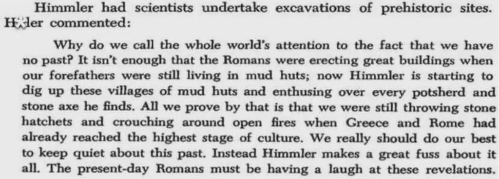 "Pourquoi attirons-nous l’attention du monde entier sur le fait que nous n’avons pas de passé ? Ce n’est pas suffisant que les Romains aient érigé de grands bâtiments alors que nos ancêtres vivaient encore dans des huttes en terre ; maintenant, Himmler commence à déterrer ces villages de huttes en terre et à s’enthousiasmer pour chaque tesson de poterie et chaque hache de pierre qu’il trouve. Tout ce que nous prouvons ainsi, c’est que nous étions encore en train de lancer des haches de pierre et de nous accroupir autour de feux ouverts alors que la Grèce et Rome avaient déjà atteint le plus haut niveau de civilisation. Nous devrions vraiment faire de notre mieux pour garder le silence sur ce passé. Au lieu de cela, Himmler en fait toute une histoire. Les Romains d’aujourd’hui doivent bien rire de ces révélations."