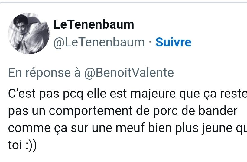Me suis deja disputé plein de fois avec ce genre de trou du cul. A 19-21 on devient un homme/ une femme dans une société normale, point final. L’age adulte implique qu’on fait ses propres choix. Si une meufs de 20 ans se met avec un vieux