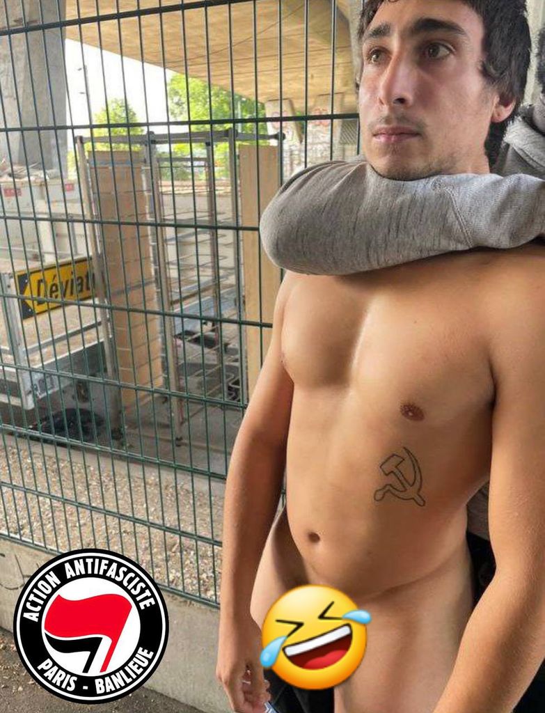 Ses amis antifa l'ont abandonné face à une équipe de chof en sous-nombre. Résultat il s'est retrouvé à poil