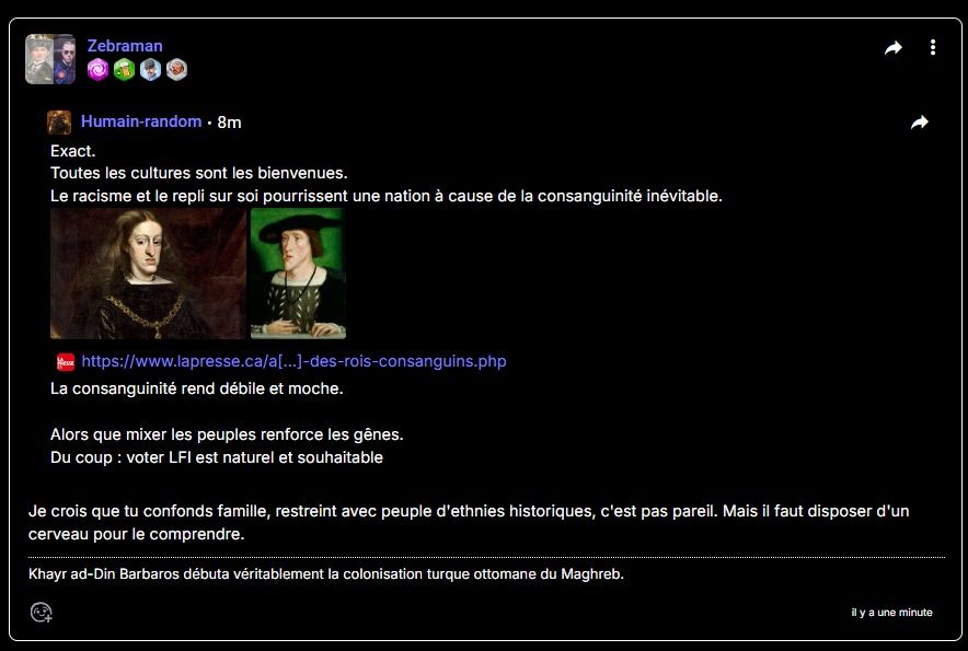 En fait, la consanguinité en terre islamique, tu en as pas mal, mais l'idée de dire que des ethnies historiques qui se développent sont consanguines, c'est avoir le besoin d'utiliser le dictionnaire pour comprendre ce qu'est un consanguin. Tu peux avoir des dirigeants occidentaux sans qu'ils soient dans des mariages consanguins, c'est pas interdit.