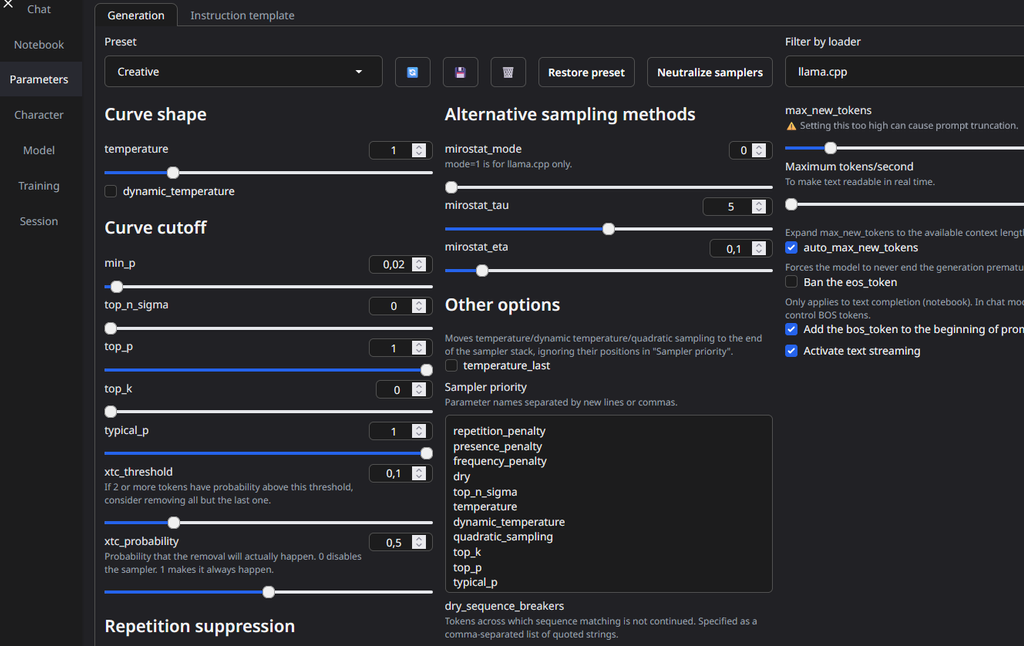 Également, pour l'orienter, tu as un truc extrêmement puissant, c'est qu'avant de commencer le dialogue, tu lui fais dire des truc hard dans le champs de contexte, juste après la description. Respecte bien les balises {{char}} et {{user}} dans text-generation-webui, il comprend :