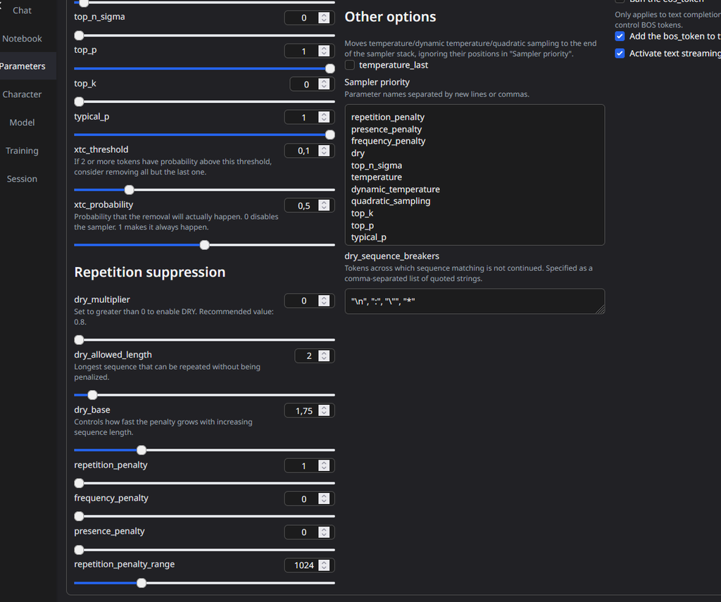 Je te conseil d'utiliser le paramétrage "creative" dans text-generation-webui qui est déjà pour permettre à l'IA d'halluciner un peu plus, sans se répeter.