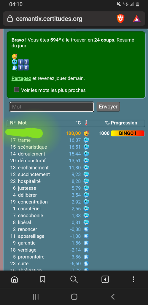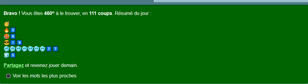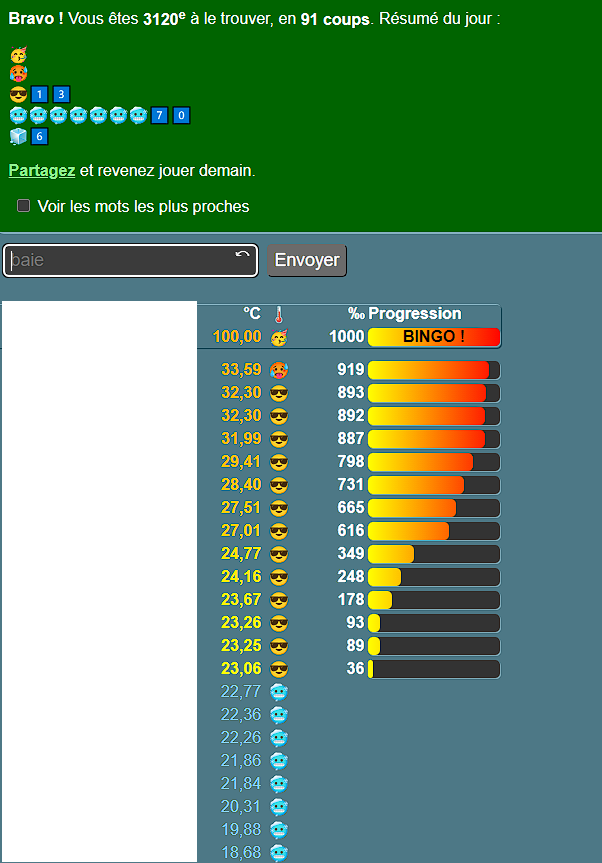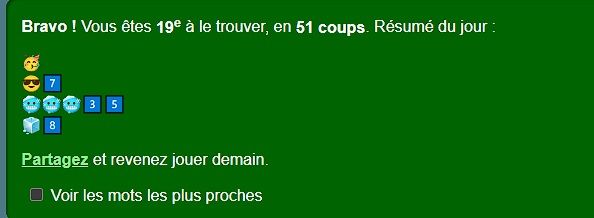 Tu ne pas compris clé. J'ai trouvé le mot du jour en 24 coup sans avoir un seul mot dans le top 50% et sans l'ai de du forum