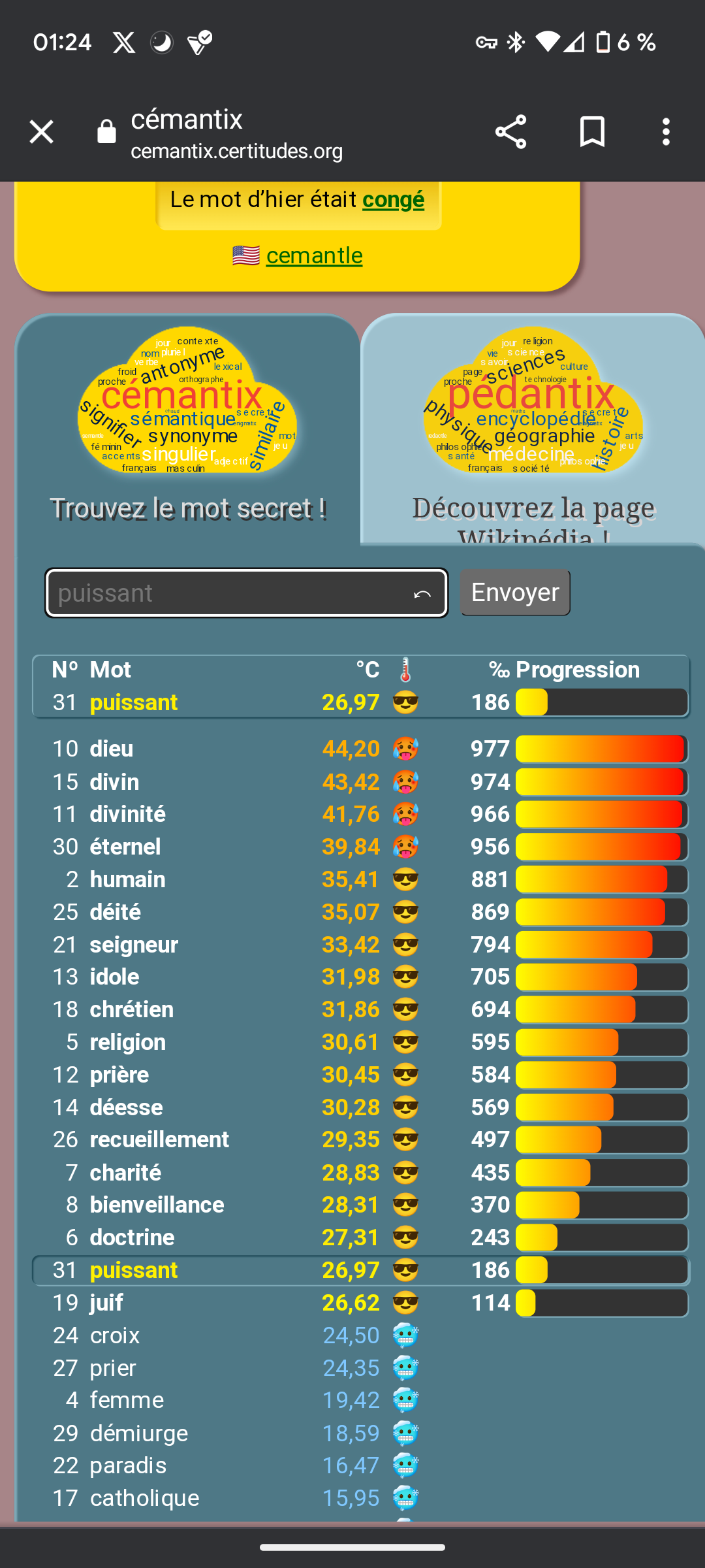 Exemple: je suis parti dans le champ lexical de la politique, que des mots entre 30 et 40 degré, du coup pour trouver le mot du jour qui était beaucoup plus généraliste ça a pris du temps