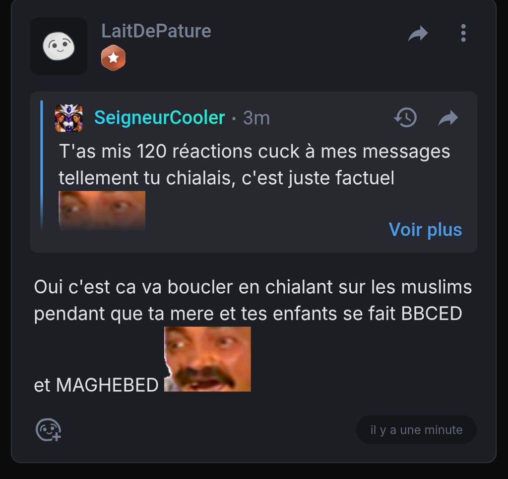 Oui c'est ca va boucler en chialant sur les muslims pendant que ta mere et tes enfants se fait BBCED et MAGHEBED