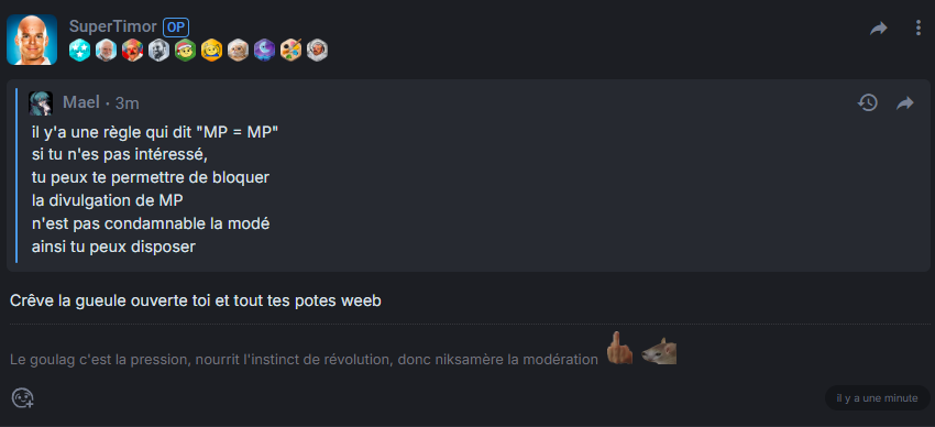 J'ai pas de problèmes avec ça à la rigueur, mais sachez juste que ça crée des comptes exprès pour harceler mp, c'est tout. Je signale pour le bien du forum.