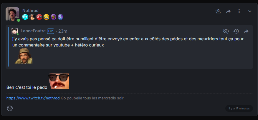 Il ment tellement fort. J'ai dit Mathis au hasard. Mec, tu signales en modé pour imputer une exposition d'identité. Je pouvais aussi dire Titouan. Si tu fais ça aux modos à chaque fois, viens pas pleurer.