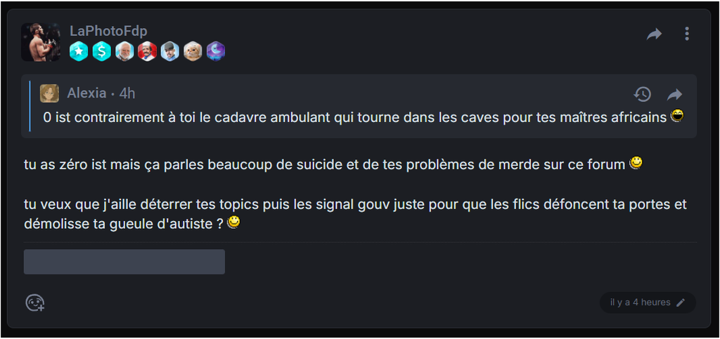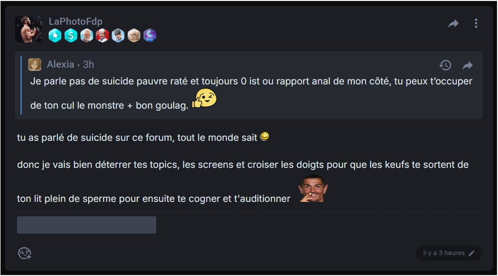Ça fait un mois qu'il me cherche (pour rien) ça fait un mois que je l'humilie continuellement et il continuera encore et encore , parce que de son propre aveu c'est un alcoolique 5/10 dépressif de 40 ans qui semble avoir des problèmes de couple (j'en déduit que sa femme l'a quitté en analysant certain de ses post). Je dis pas ça pour l'attaquer , on a tous nos soucis moi le premier , je dis ça pour que tu comprenne qu'il n'a que ça a faire.