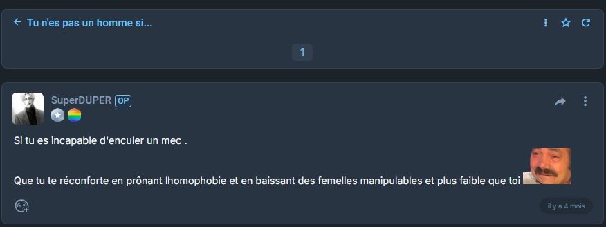 Il n'y en a pas tant que ça et je supprime tous les posts qui contiennent des propos pédés