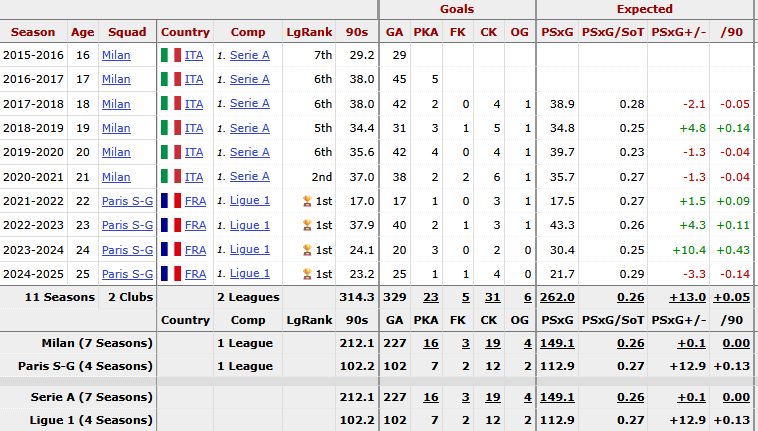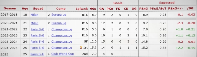 Donnarumma is a gk focusing his energy, skill points on being s shot stopper and because of that he is one of the best if not the best in the world at it. Chevalier on the other hand is a good shot stopper even though maybe not exactly as good. But he is clearly superior to Donnarumma when it comes to dealing with crosses, his ability on the ball, as well as his distribution. Donnarumma was one of the few PSG players of the current squad that was not a Luis Enrique signing, having arrived in 2021 back then PSG's squad was different. It's safe to say taht without his performances against Liverpool, Aston VIlla and Arsenal, PSG wouldn't have reach the UCL final and win it. However he still had weaknesses like in the previous seasons or even this season in ligue 1 where his greatest strenght wasn't up to his own standards, a standard that he set over the last few years. Over the seasons, there were matches when Donnarumma looked unbeatable and other where he would make these mind numbling mistakes, especially that one against Benzema in the UCL in 2022. In the 2024 / 2025 season, Donnarumma had a career low saving percentage 67% in ligue 1. Lower than his 2017 / 2018 season when he was just 18 years old. His 2023 / 2024 season was his highest season in ligue 1 with 84,5% save percentage. A better stat is post shot expected goal. In his first season it was slightly negative. In the 2024 / 2025 season, his post shot expected goal was 21,7 ( against 17,5 in the 2021 / 2022 season ). He conceded 25 goals in 2024 / 2025 season, meaning that he let about 3 goals more than would be reasonably expected of a keeper.