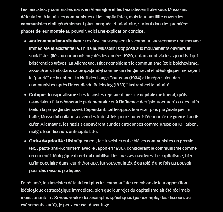 Le fascisme a dû se modérer. Mais le fascisme total et libéré de la bourgeoisie, ça donne des politiques qui feraient passer Mélenchon pour Reagan