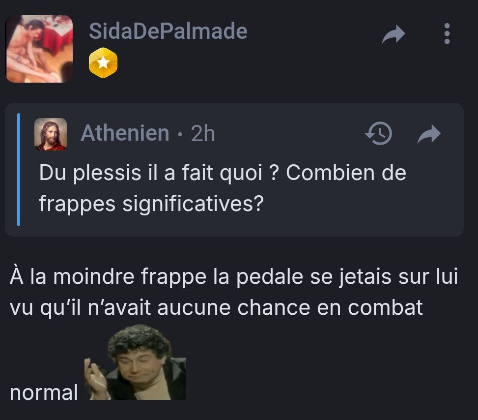 Oui il a reconnu son talent à la fin du combat et je pense que c'était sincère parce que rare sont les gens qui arrivent à résister à sa lutte sur 5 round