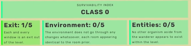 Level anchromotopsia.The level looks different to everybody who comes here. it takes the appearance of a place in which you spent a lot of time at in your childhood when you were in the real world.It can shift to other locations that you stayed at often. Other people or even entities are illusions projected by the level in front of you. You more you stay the more your surroundings become more glitchy and blurrier. At the end of the day you will just be able to see pixels. Even if it's class 0 difficulty it's almost impossible to get out off. The few people who made it out claimed that the only way to exit is when the level is shifting its design. The level keeps you alive no matter what. If you want to hit your head first, the level will probably shift into a trampoline for example. To enter here, it happens randomly. To exit, wait until the level is shifting between memories and you can quickly find a levle key that will open a door that you know is out of place. It's rare so you have to wait.