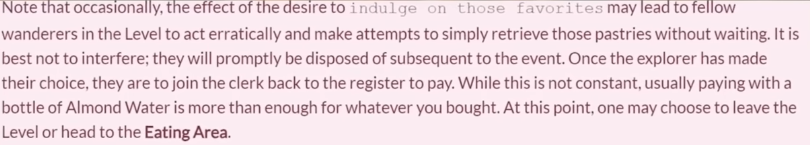 After getting your command you can go to the seating area. It's only visible after you pay your food after order. To pay, give almond water to the cashier. The effects from the pastries vary from wanderer to wanderer. If you order the one you like the best, it's the worst. Less than 1 feet away from the pastry there will be a irresistible urge to eat it. If you ingest it in the first 5 minutes you start getting a sore throat, in the first 10 minutes, get gastritis, 12 minutes you get extreme arrythmia derma and after 20 minutes you will go into cardiac arrest. Do deny this impulse. After a person succumb,ed one of the worker will drag you to where the kitchen is and when this happens, the clerk and the worker that drag the body back will vanish into the back kitchen. If you eat a more neutral pastry, nothing really bad happens. Since the level tries to give you what you really likes, it's kinda rare. The least favourite or hated pastries are the safest To get out of the level, order one of these that you don't like and eat it. Eating the disliked food might lead the wanderer to believe that the smell and look in the taste of desert is far worse than it seems. Some reported the smell and taste of rotten flash when eating these pastries. When you eat the patry you don't like even if it has rotten flesh, you will be transported to either level 11, level 31, level 57 or level 98. You will just be slightly sick.