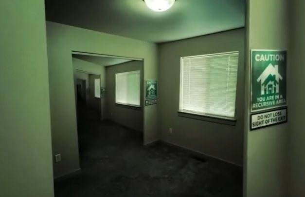 Level 525252, etc... aka the Recursion. The main difficulty is how to exit the level. It's class 0 difficulty. To enter this level you can accidentally noclip there. But the most consistent way is to fall asleep inside of any chair of any type on any level. No entity in this level. The only way to leave these infinitely repeating rooms of the recursion is to go to one of the windows, open up the blinds, open up the window, climb out into the white void beyond. It will send you to any level in the backrooms, good or bad. If you look away from the exit or if you don't see where the exit is, it could break all of the recursion and thus corrupt the hallway that you are in, leaving you stranded. As the warning of the level says, don't look away from the exit.