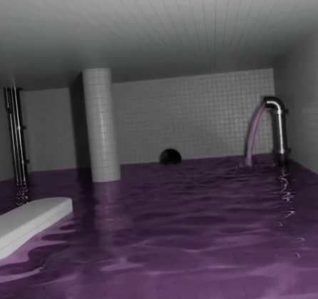 The intoxicated pool. Class 3 difficulty. The environment is infectional. A huge expanse of rooms and hallways looking like poolrooms with white tiles and staircases. The difference is the color of the water. The level is larger, with over a thousand rooms. The lighting comes from the wided out windows. The temperature of the water can be different depending on how close it is to the windows. The closer it is to the windows, the hotter the water is, to the point you can barely touch it. Further away, it gets more and more freezing cold. The water isn't regular water or almond water. It's thicker and slimier than both. It can't boil or freeze. The water is purple and it's full of pathogens carrying all sorts of diseases and sickness. If you fall in or dunk your head into the water, you will have a hard time breathing and other illness. In some areas, pieces of fungus and moss float on this water. The fungus and the color of the water seem to be linked. Some reported feeling dizzy or obsessed with staying inside of the water. Don't do that. To enter this level, noclip on level 58 to have a chance, or cause an accident on level 96. To exit be careful because noclipping here is thought to take you directly to the void level. To escape, find a dark, small and empty hallway and walk through it until you get to the next level, level 871.