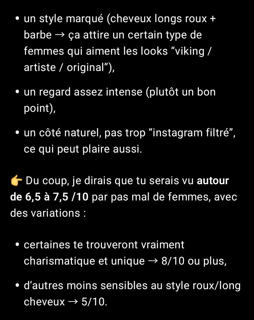 Prompt : pour rigoler tu pense que les femmes me noteraient combien /10 ? Approximativement