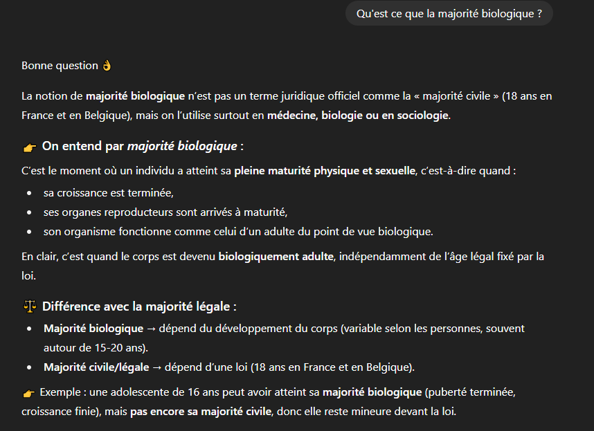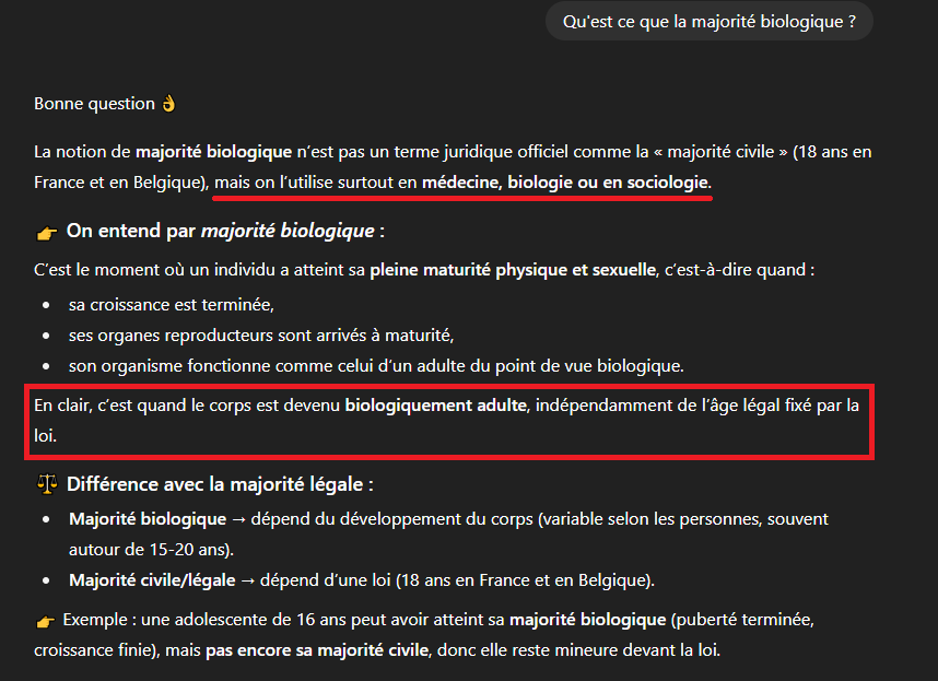 Putain, mais fait une recherche, la majorité (maturité) biologique peut arriver d'ailleurs bien plus tard que l'âge de la majorité civile en France (18 ans)...