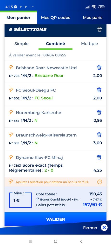 Perso j'avais failli gagné 200 euro mais sur 5 match validé dans le combiné j'ai eu 1 match de perdue (cela c'est produit 2/3 fois avec les même espérance de gain donc 200/400 euro de gain potentiel)
