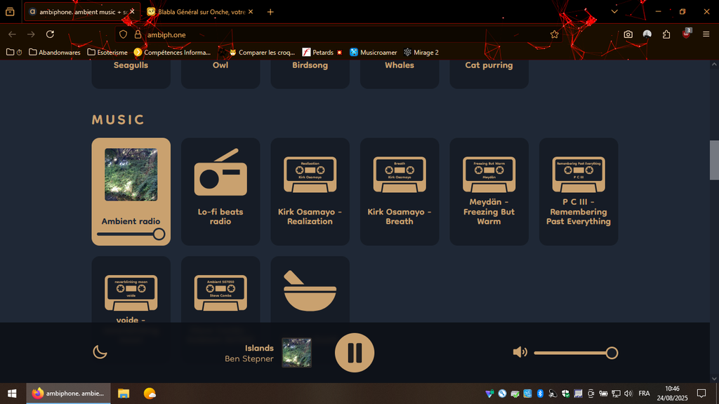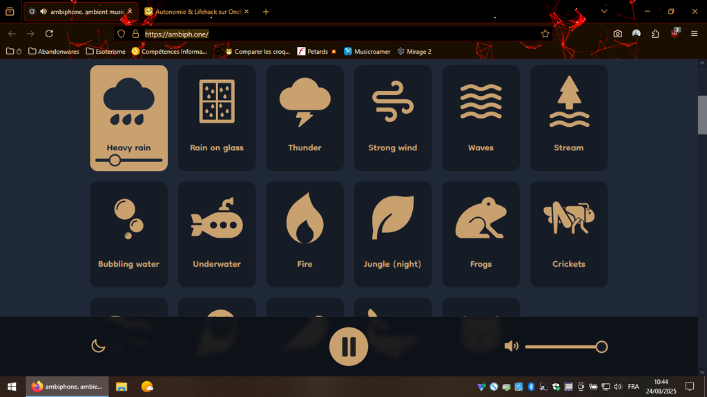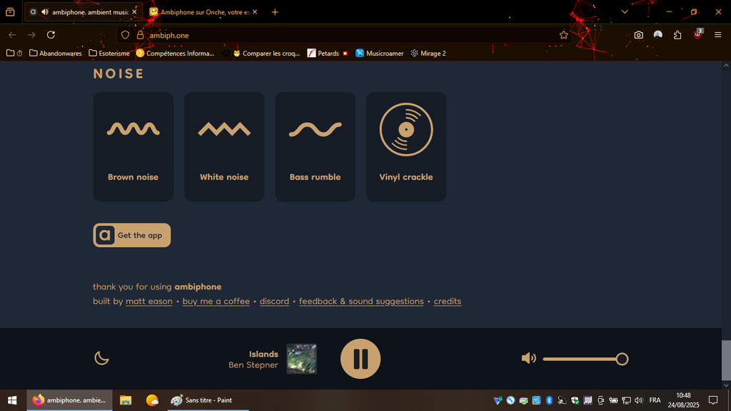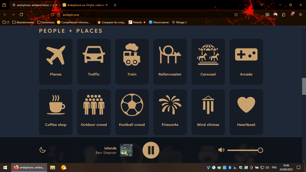 Ambiphone permet de générer un bruit de fond mixable entre plusieurs paramètres, pratique quand vous avez comme moi un voisin débile, pour dormir ou travailler de façon zen.
