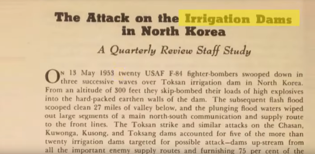 By 1951, the AIr Force said they destroyed 145 000 buildings. With napalm, victims are presented with a hard black crust where their skin used to be the burns would become infected, causing a spattering of yellow pus to grow. Journalist George Barrett of the New York Times would report on a destroyed village in February 1951 : " Throughout the village and in the fields, were caught and killed and kept the exact same postures they had helf when palam struck. A man about to get on his bicycle, boys and girls playing in an orphanage, a housewife strangely unmarked holding in her hand a page torn from a Sears Roebuck catalog. There must be almost 200 deads in the tiny Hamlet. James Ramson Jr described the effects when his unity accidentally was struck by a petrol jelly Ransom. He said that his man began writhing aroud in the snow. on the groud and begged for him to shoot them. Their skin burned, charred and dried out then flaked away. " Like fried potatoe chips " Private First Class James Ramson Jr. The US flattened so many structures that they soon started running otu of targets. So in July of 1952, the US began a bombing campaign starting to target hydroelectric dams. An official US Air Force study would report that in May of 1953, 20 F 84 fighters bombers slammed the toxong irrigation dam with high explosives. The dam subsequently erupted. And water came cascading down, flattening everything an area 27 miles long, who was completly obliterated. The US would ultimatly attack 20 irrigation dams that provided water for 75% of North Korea's food production. And that was precisely the target. The Official Air Force study would boast about the attacks : " To the communists, the smashing of the dams meant primarily the destruction of their chief sustenance rice. " Source : Robert F; Futrell et all " The attack on the irrigation dams in North Korea " AIr University Duarterly interview ( 1953 ).