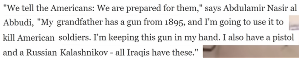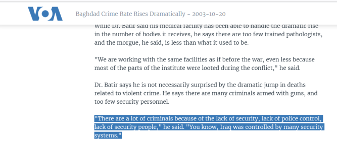 https://www.voanews.com/a[...]hdad-67585742/389194.html " "There are a lot of criminals because of the lack of security, lack of police control, lack of security people," he said. "You know, Iraq was controlled by many security systems." " The lack of security reflected poorly on the Americans. One of the main factors undermining their credibility was to choose the Iraki people as the people to pacify and subdue. It proved to be unwise. Outside the national pride, it was the same people who kicked out the Brits and gained their independance 70 years ago back then. Iraq was also historically a Hardy Agricultural Society. Another way of putting that would be they were heavily armed. Irak was one of the most heavily armed societies in the world. Irak per capita rivaled clans like those Yemen and Somalia. Almost everyone was armed. But those corroded rifles and pistols passed down generations were the least of American problems.