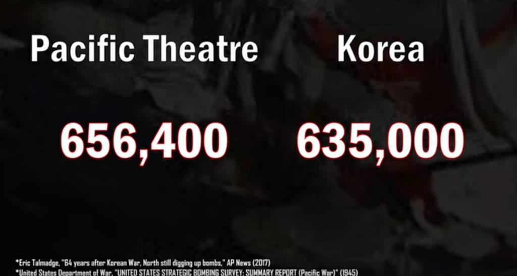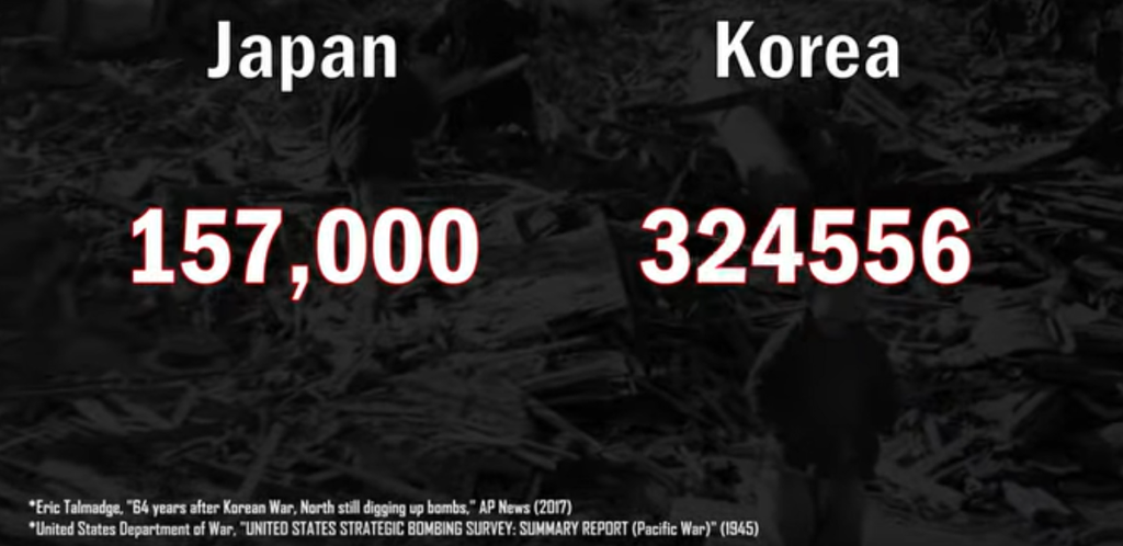 Due to the Korean war, both North and South Korea became one of the most heavily bombed countries in history. The tonnage of bombs dropped in Korea was the equivalent of all bombs dropped in the Pacific theater of WW2, which includes the 2 atomic bombs. By US own estimates, the destruction of Korea proportionately greater than that of Japan after the atomic bombs. The US entered the war after the north invaded the south, capturing Seoul and nearly the entire Korean peninsula. The US sent tens of thousands of troops. They then cross the border to the North. This was the trigger for the Chinese to enter into the war. In the first few months of the war, the US was hesitant to bomb cities population centers because of the fear that it would pull both China and the Soviet Union into the war. But the Chinese were secretly here the whole time. In November of 1950, the United Nations would be in for a surprise when they got into a skirmish with the Chinese Communist Forces. This stunned american officials and the US would retreat back down to the 38th parallel. The barrier was lifted and the bombing campaign would commence. The philosophy behind the bombing was the successor to the firebombing of Japanese cities in WW2. In fact, it involved the same people, Emmett O Donnell Junior and Curtis Lemay. In Korea, firebombing came in the form of napalm. The US would drop over 30 000 tons of the stuff over Korea. The fire engulfed and destroyed quite literally anything in its path. and completly wiped villages and cities out of the map. Villages were considered by General McArthur as a legitimate military target. : " Every installation, facility and village in North Korea now becomes a military and tactical target. "