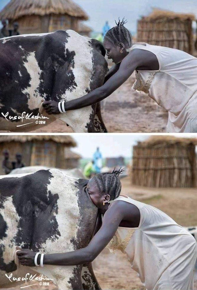 Chez la tribu Suri en Éthiopie 🇪🇹, une croyance ancestrale veut qu’une vache produise davantage de lait si l’on stimule certaines zones sensibles et que l’on caresse ses pis
