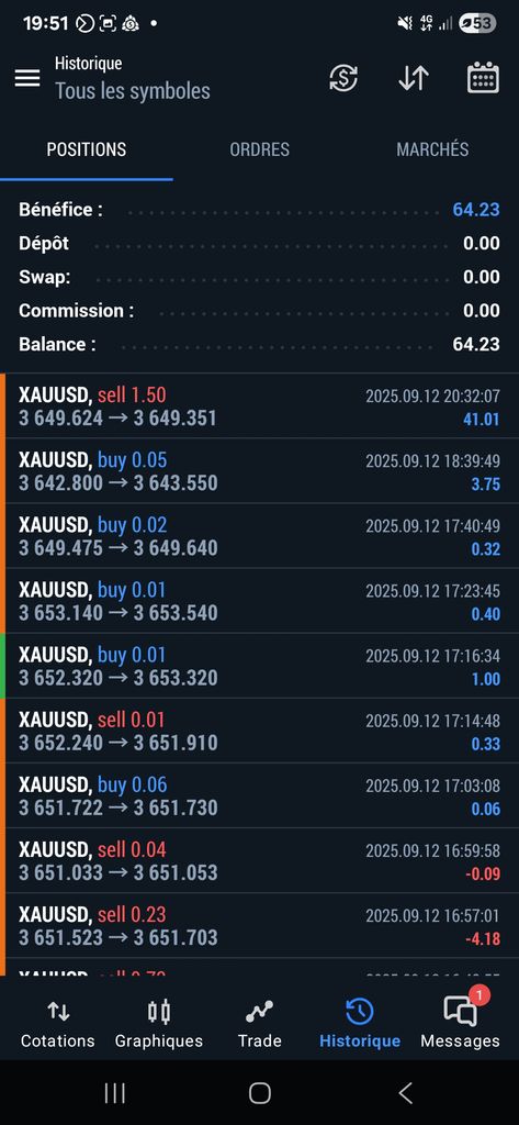 lundi j'avais autorisé trop gros en prise de lot et le cours de l'or il a pris 40 dollars donc j'ai fait - 600 parce que j'avais un stop loss à 25 % sur 2000 et hier j'ai fait moins 30 et là aujourd'hui sur la demi-journée j'ai fait 20 dollars de bénéfice