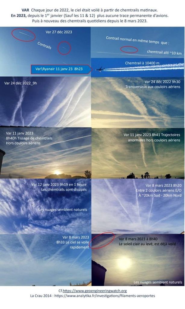 Et comment tu expliques les petits dessins...les traînées que certains avions laissent et pas d'autres alors qu'il s'agit bien de la même zone aérienne donc ça ne s'explique pas par un taux d'humidité différent, ni une différence d'altitude ou que sais-je.