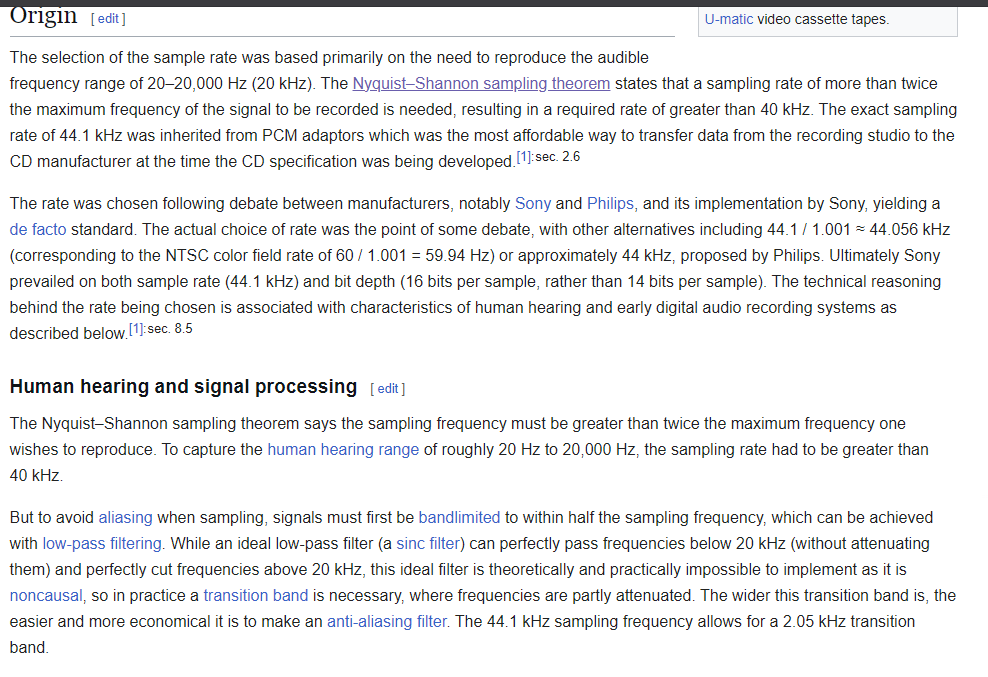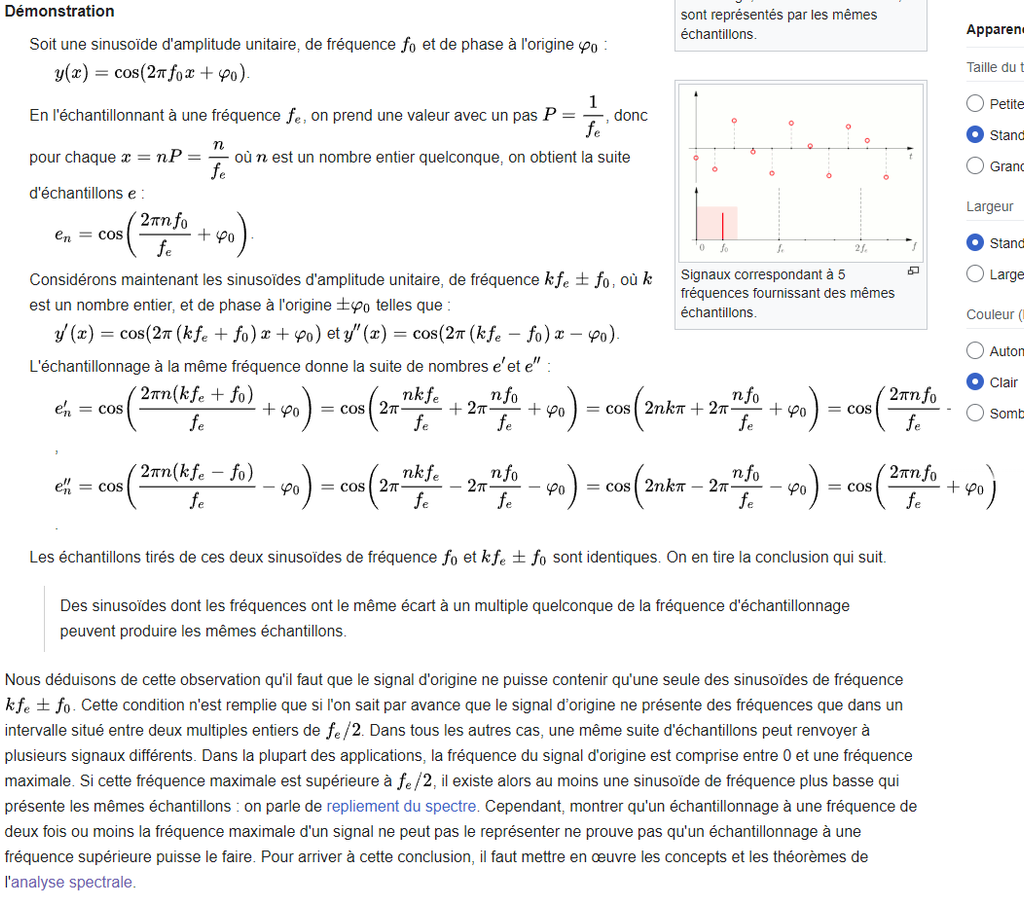 Et si wiki dit que 44kHz reproduit 100% de la qualité du son, c'est bidon pour des raisons evidentes decrites precedemment :la condition de shannon nyquist c'est un cas limite inferieur ssi on connait la forme du signal.