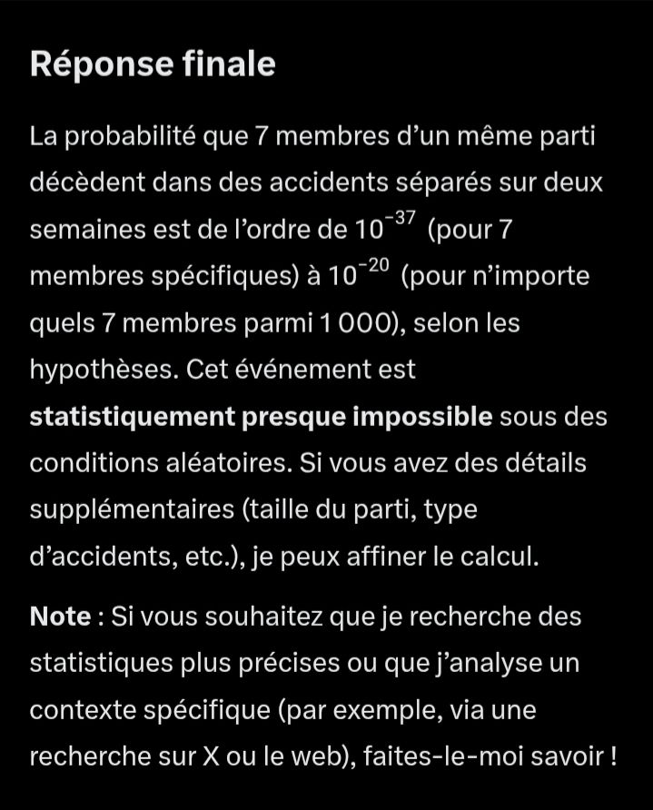 Car la probabilité que 7 députés d'un parti meurent d'un accident en 2 semaines est quasi nulle.