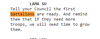 Un peu plus tard, lorsque Taun We raccompagne Obi-Wan à son vaisseau, elle parle de bataillons