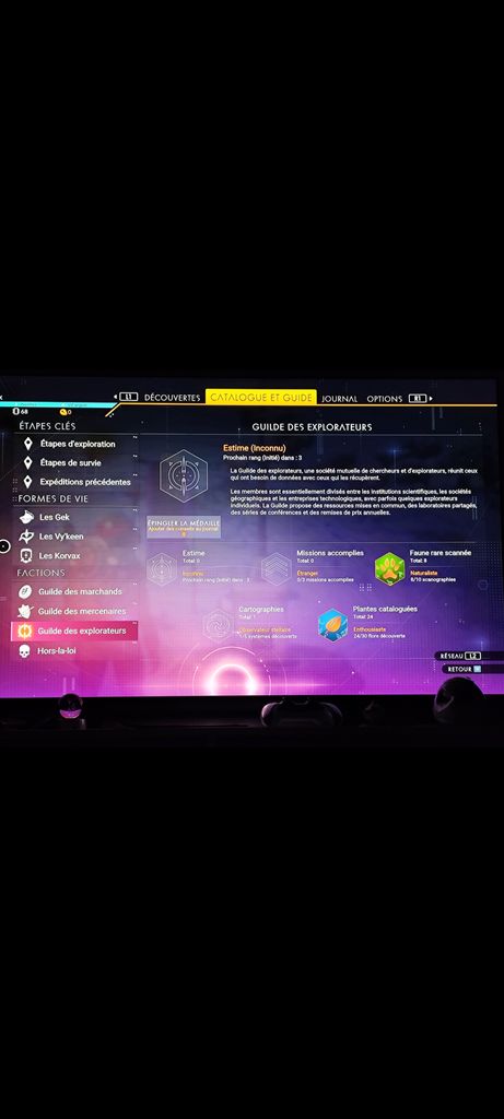 là t'a les sortes de trophées, les 3 races majoritaires qui peuplent l'univers ( avec chacun une estime, des missions, une langue à apprendre ), et les factions ( avec estime, missions et chacune 3 points spéciaux )