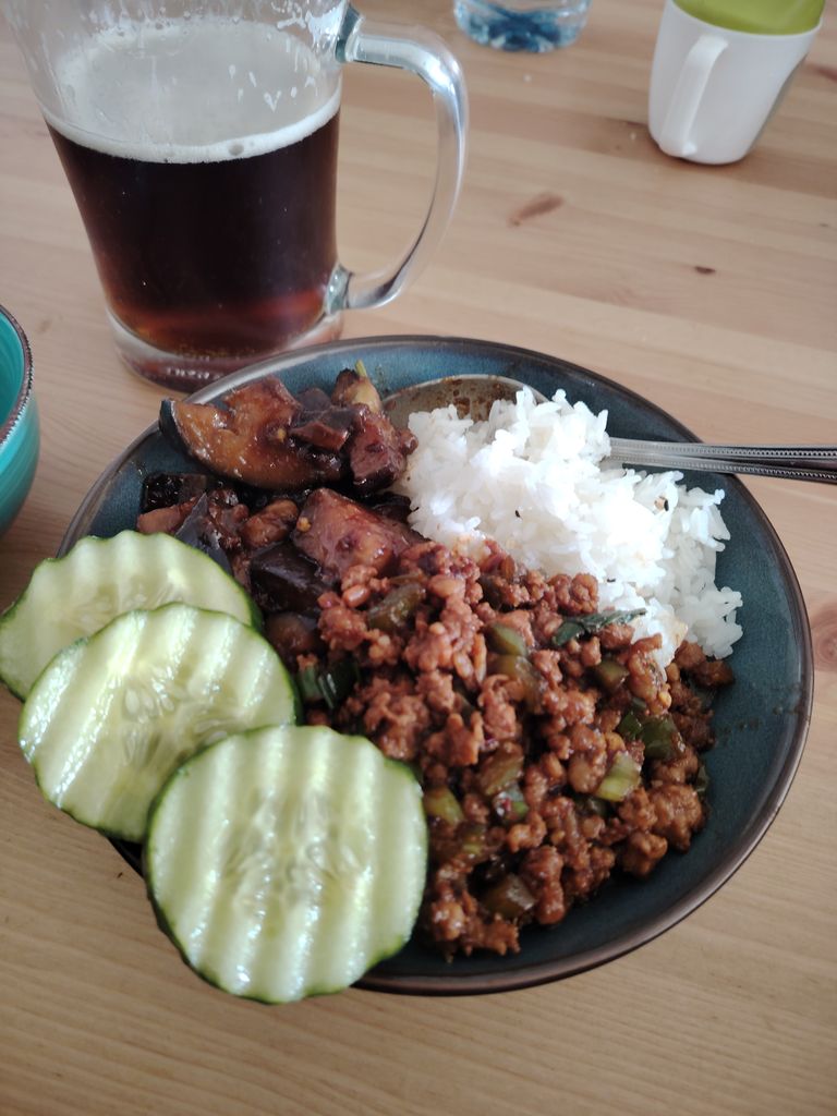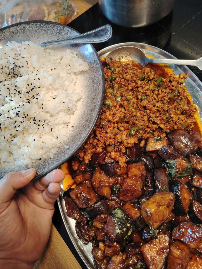 Au 1er plan ce sont des aubergines sautées au poivre du sichuan et au basilic sacré. Au second plan c'est du porc haché sauté au piment et à la cebette