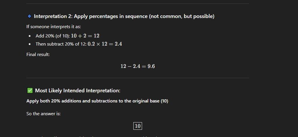 (10 + 20%) - 20% = ?