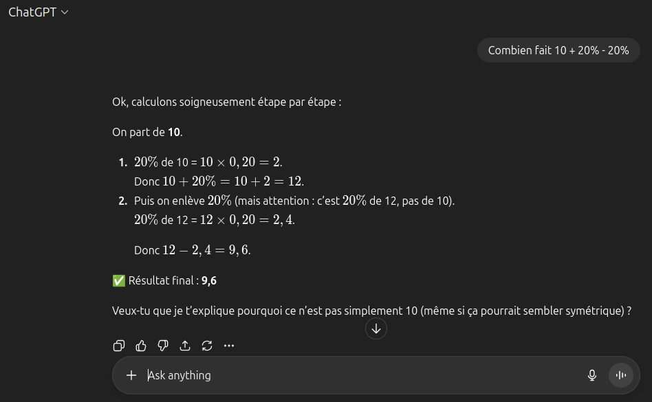 Donc 10 + 20% - 20% = 10 + 0.2 - 0.2 = 10